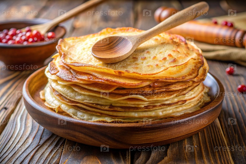 Вкусные блины на деревянном столе.Блины складываются в большую кучу.Концепция российского праздника Масленицы
