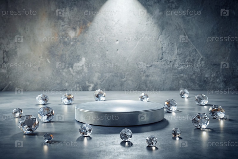 Минималистский фон для выставки ювелирных изделий. Современный пустой подиум с серой стеной и бриллиантами. Креативный дизайн презентации продукта