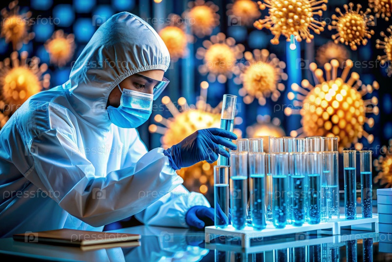 Ученый в лабораторном пальто и защитной маске осматривает трубки с светящимся вирусом в лаборатории, что символизирует продолжающуюся борьбу с инфекционными заболеваниями, важность исследований и изобретений вакцин