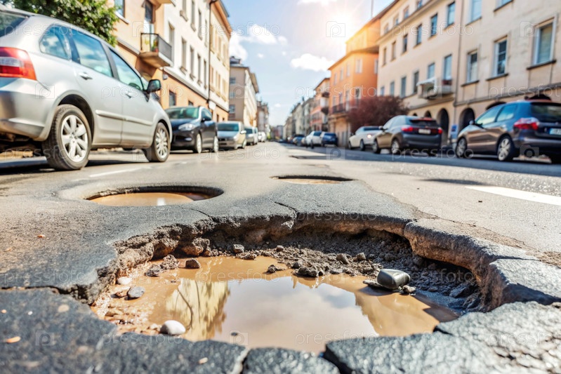 Ужасное состояние дорог. дыра в асфальте на городской улице. ремонт дороги. городская улица плохого качества