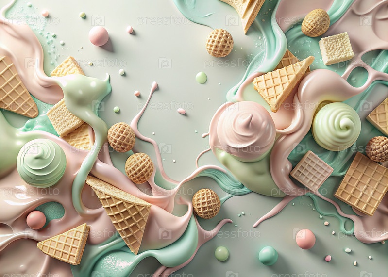 Абстрактная композиция с таяющим мороженым. Плески и брызги мороженого. натюрморт с перевернутым коном мороженого на зеленом фоне