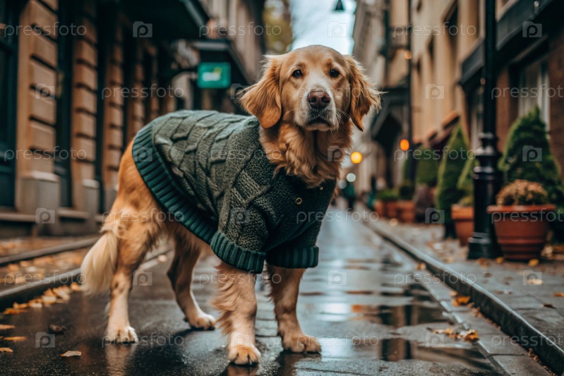 Любимый питомец - милый золотистый ретривер в вязанном теплом комбинезоне на прогулке по городу