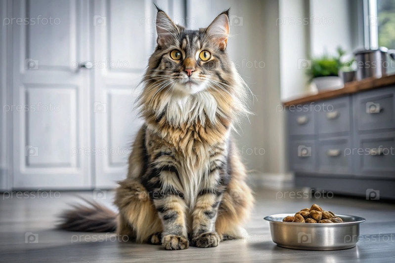 Милая кошка Майкун рядом с миской для кормления на белой кухне.Котка смотрит в камеру.Уход за животными