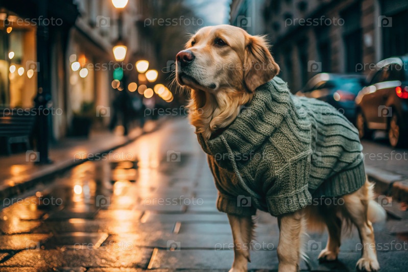 Любимый питомец - милый золотистый ретривер в вязанном теплом комбинезоне на прогулке по городу