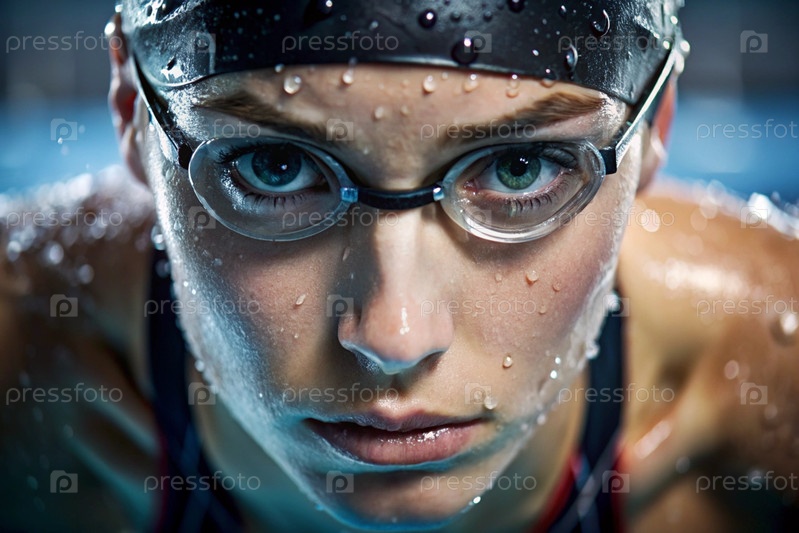 Спортивное плавание. Женское плавание. Спортсменка, которая носит очки для плавания в бассейне во время соревнований на близком расстоянии. Женщина смотрит прямо в камеру