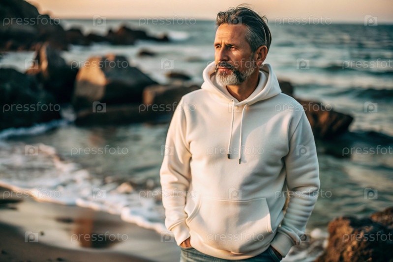 Красивый мужчина средних лет с бородой в белой капюшоне на пляже