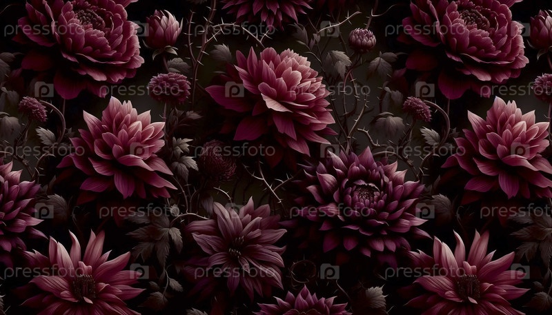 Темный мрачный цветочный бесшовный рисунок с сливовыми и бургундскими цветами на черном, Ai создал изображение