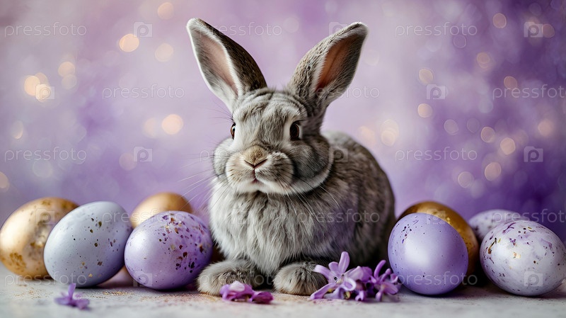 Нежные пасхальные яйца, серый кролик и фиолетовые цветы гиацинта на пастельном акварельном фоне с нежными венами