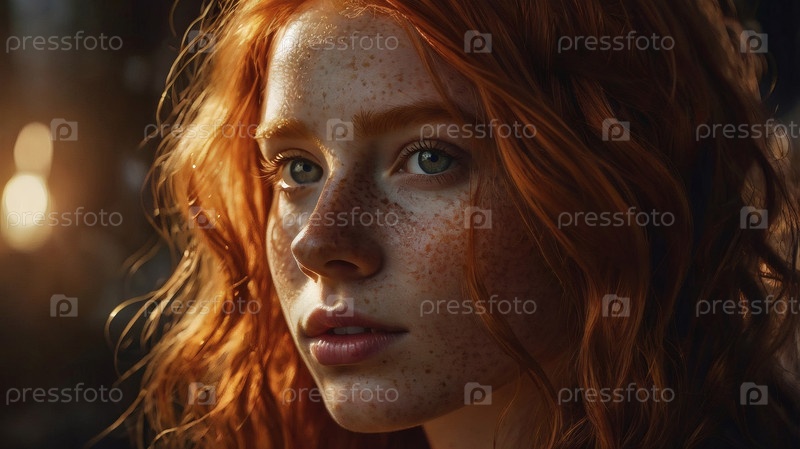 Портрет красивой рыжеволосой девушки с кудрявыми волосами и веснушками на лице в солнечном свете