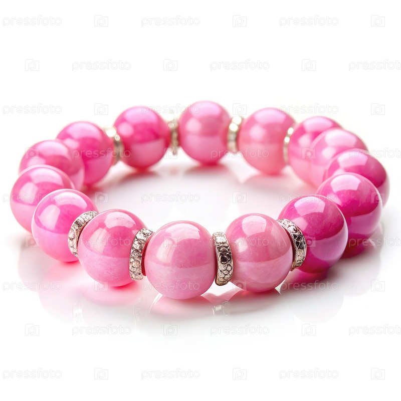 Розовый бусиный браслет с серебряными акцентами на белом фоне