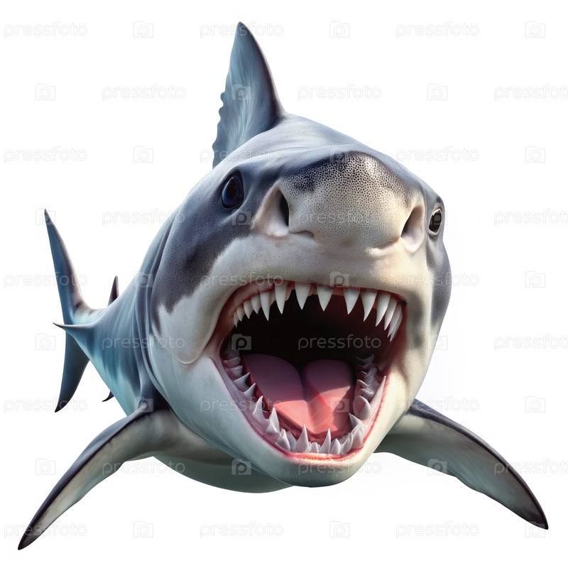 Разгневанная большая белая акула с открытым ртом на белом фоне Генерация ИИ