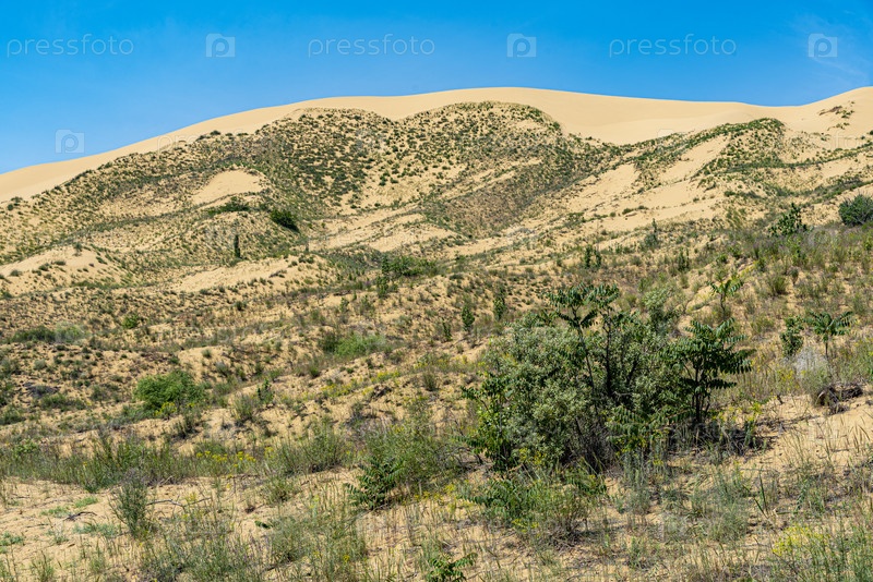 Обширный песчаный ландшафт с холмистыми дюнами и пышной зеленью