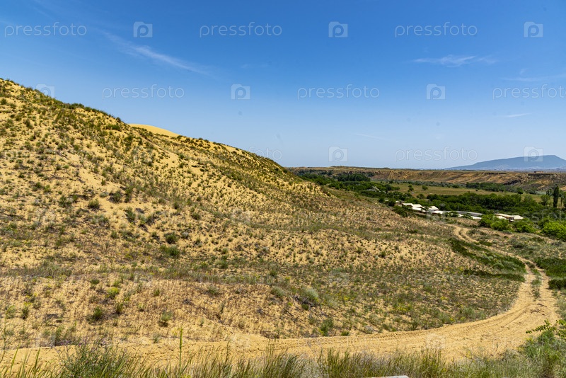 Обширный песчаный ландшафт с холмистыми дюнами и пышной зеленью