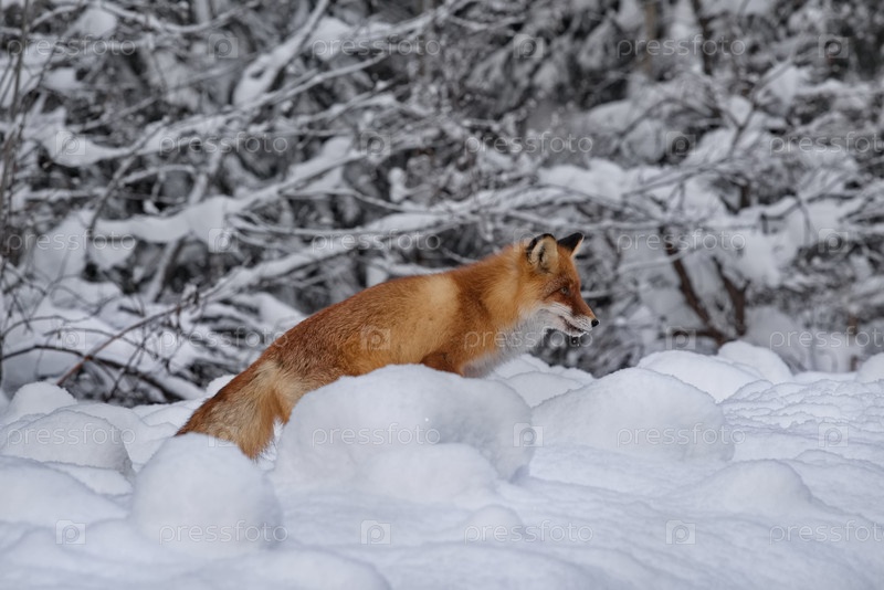 Молодая красная лиса охотится в заснеженной сибирской тайге