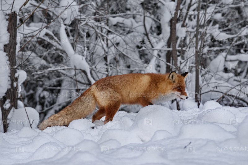 Молодая красная лиса охотится в заснеженной сибирской тайге
