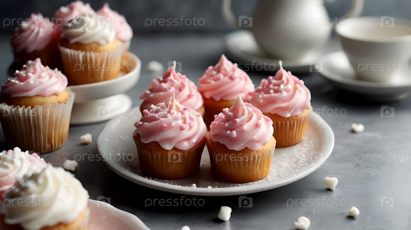 Праздничные кексы, испеченные на розовом фоне с секинами идеально подходят для романтических празднований. День святого Валентина, свадьба