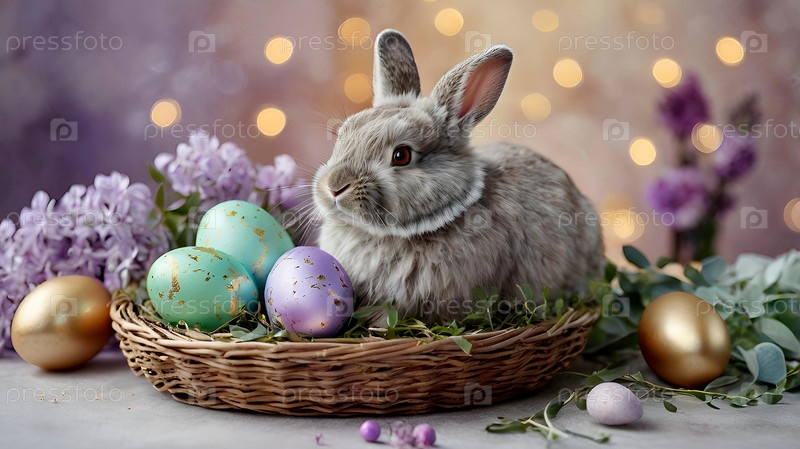 Нежные пасхальные яйца, кролик и деликатные цветы на пастельном акварельном фоне с нежными венами