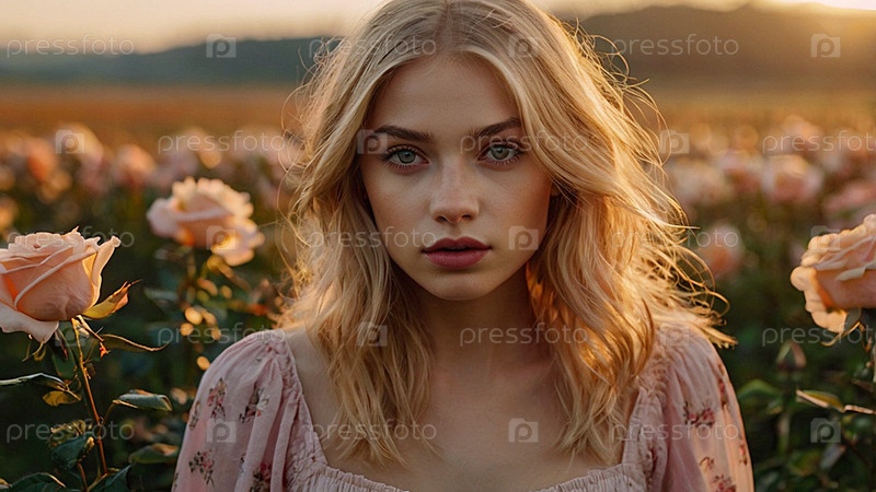 Теплый портрет красивой кудрявой женщины на цветущем поле при закате солнца. Романтическая, спокойная и чувственная фотография девушки в деликатном платье