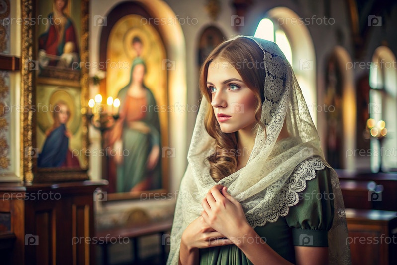 Портрет красивой молодой женщины с платками в православной церкви.Девушка молится в церкви среди икон