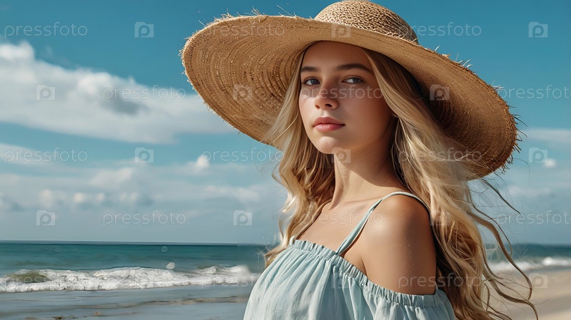 Летние каникулы на пляже, крупный план красивой женщины в соломенной шляпе.Лето. Праздники и праздники, место для копирования