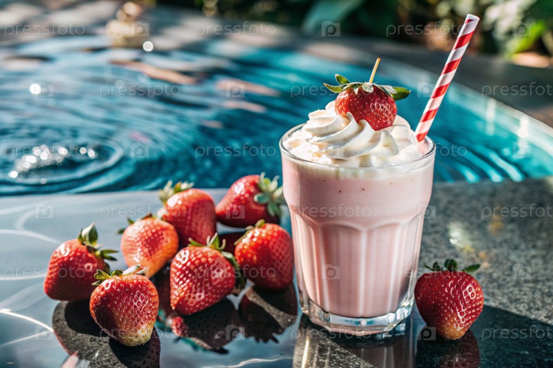 Освежающий клубниковый молочный коктейль с битой сливкой и соломой на столе, окруженном свежими ягодами