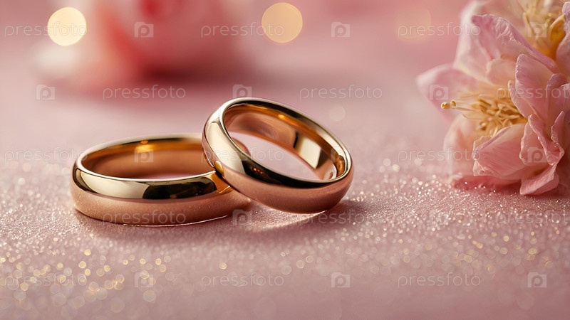 Золотые обручальные кольца на розовом фоне со стороной