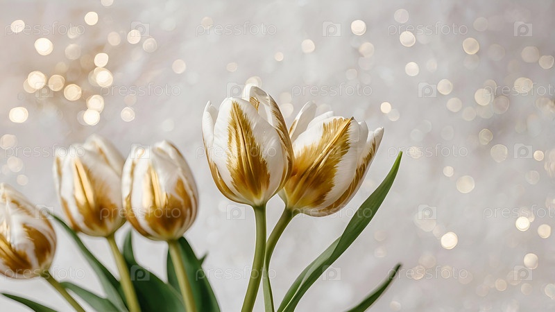 Тюльпаны - это весенние цветы. Красивый цветочный фон с красивым эффектом боке. Пузырьки тюльпана на белом акварельном фоне со золотыми венами
