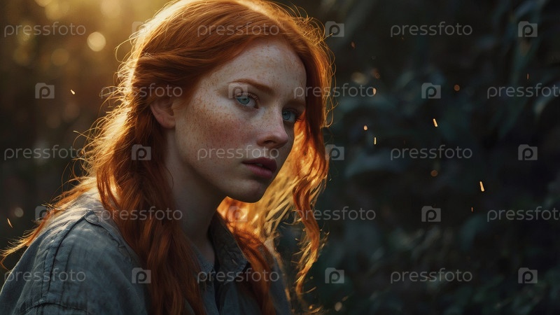 Портрет красивой рыжеволосой девушки с кудрявыми волосами и веснушками на лице в солнечном свете