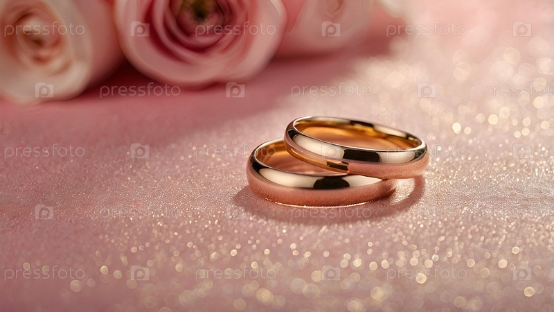 Золотые обручальные кольца на розовом фоне со стороной