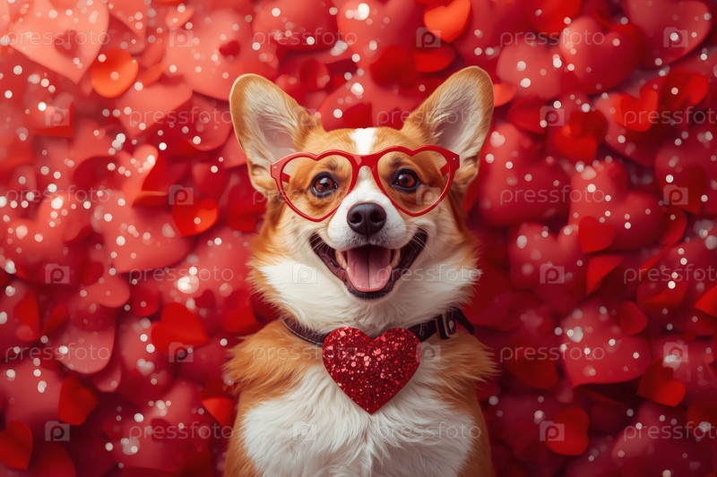 Красивый баннер на День святого Валентина с влюблёнными собаками и красным сердцем. Вид сверху. Романтическая и любящая атмосфера