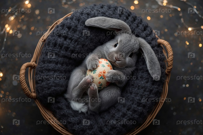 Пасхальный кролик держит пасхальное яйцо в лапах, лежит на спине на сером вязанном одеяле и смотрит в камеру
