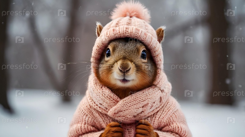 белка с большими щеками, одетая в уютную мягкую розовую тёплую одежду, шляпу и шарф на зимнюю тематику