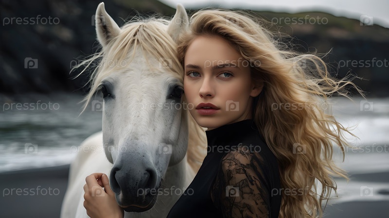 Портрет красивой женщины на пляже с черным песком против моря.Романтическая, спокойная и чувственная фотография девушки в нежном платье и лошади