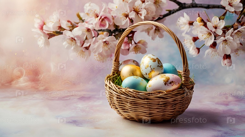 Нежные пасхальные яйца и вишневые ветви цветут на пастельном акварельном фоне с нежными полосками