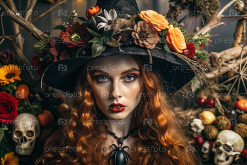 Концепция Хэллоуина. Ужасное. Костюмированная вечеринка. Красивая женщина в костюме ведьмы. Баннер, открытка
