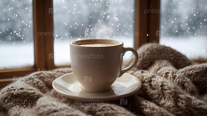 Чашка горячего какао или кофе на зимнем окне напитка испаряется.Уютное фото в нежных, теплых бежевых оттенках.Гармония и уютная концепция Рождества и зимы