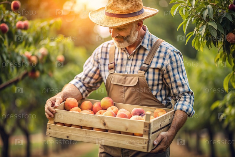 Сельскохозяйственная промышленность. Деревянный ящик с персиками в руках фермера-мужчины. Садовник собирает богатый урожай. Ближе, солнечный свет. Осенний урожай фруктов