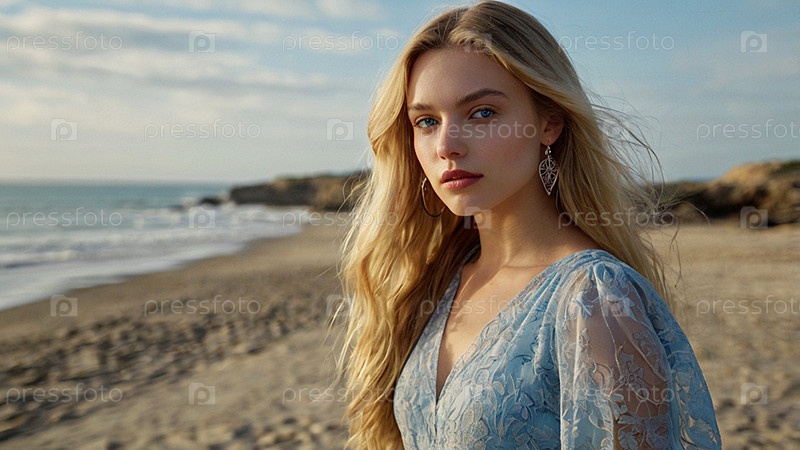 Портрет красивой женщины на пляже перед морем.Романтическая, спокойная и чувственная фотография девушки в проветренном нежном платье
