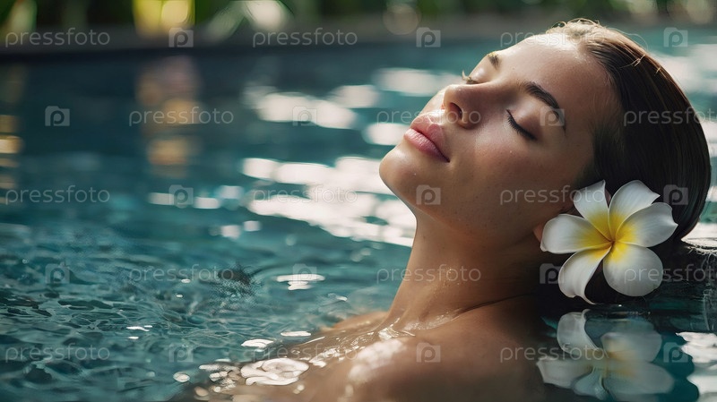 Близко. красивая молодая женщина в бирюзовом бассейне. концепция здорового образа жизни, отдых, расслабление, туризм, косметические спа-процедуры в курорте красота, гордость