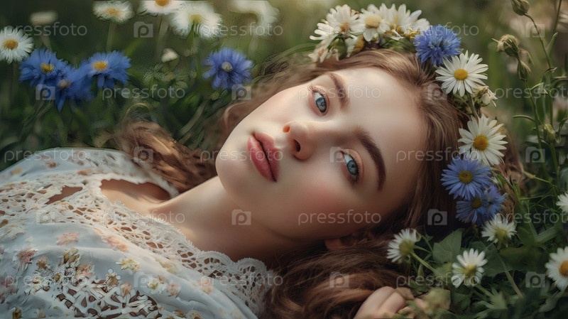 Красивая девушка с венком ромашки и кукурузных цветов на голове в поле. День святого Петра и Февронии. Всероссийский день семьи, любви, верности