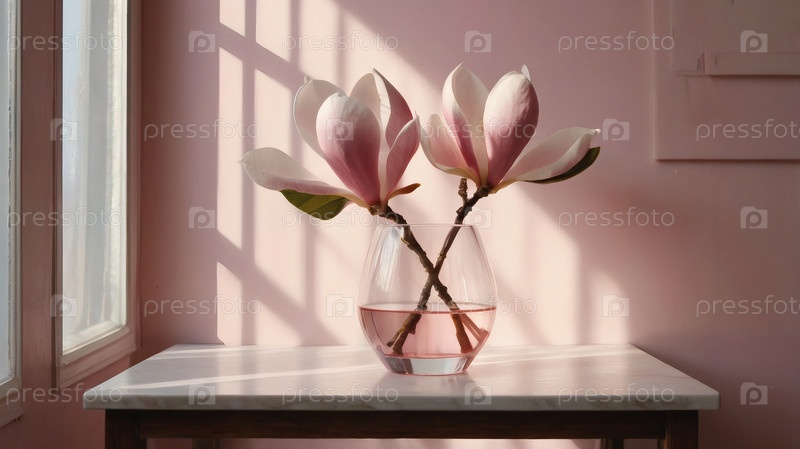 Элегантная магнолия цветет на ветке в стеклянной вазе на розовом фоне с контрастным солнечным светом. Нежные цветки с розовыми оттенками. деревенская ветка