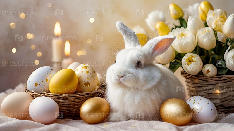 Нежные пасхальные яйца, кролик и деликатные цветы на пастельном акварельном фоне с нежными венами