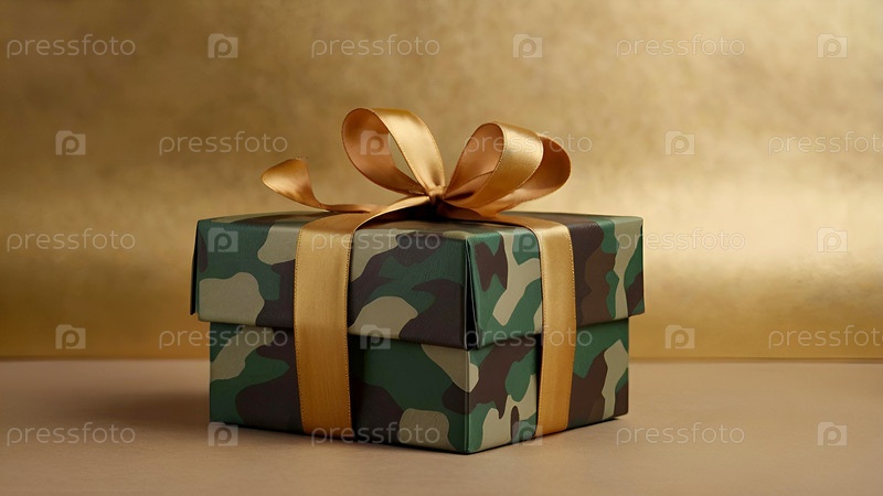 Концепция Дня защитника Отечества 23 февраля.Подарок камуфляжной коробки с праздничной сатинной лентой лука на золотом фоне