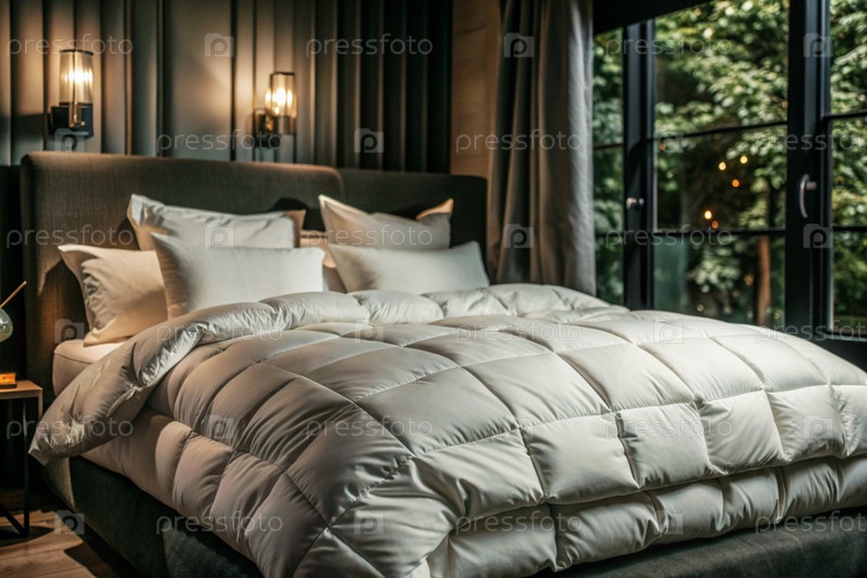 Подготовка к холодному зимнему сезону, уборка дома, гостиничный или домашний текстиль.Белое сложенное одеяло лежит на постели для макияжа