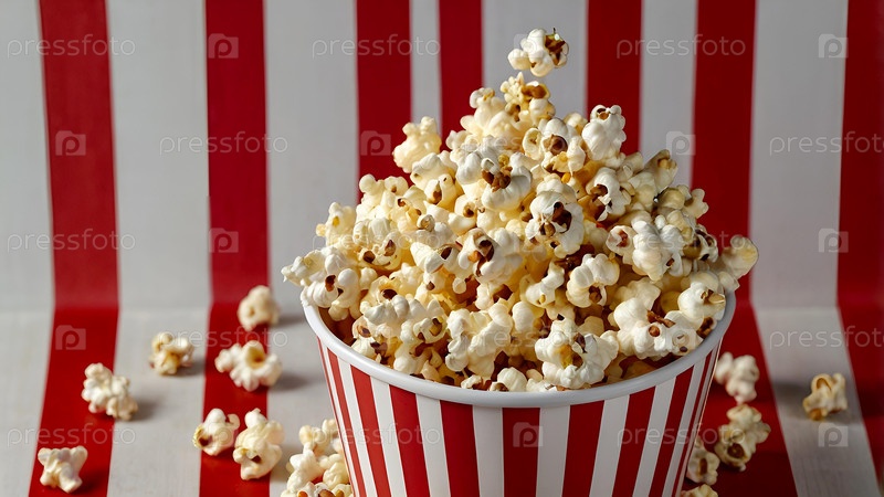 Красно-белый полосатый ящик с солеными попкорнами.Популярная закуска в кино
