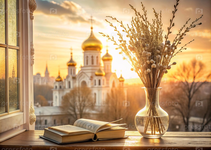 Большой план букета ивы в стеклянной вазе и книги Библии напротив старого белого окна с видом на золотые куполы храма и заходящее солнце
