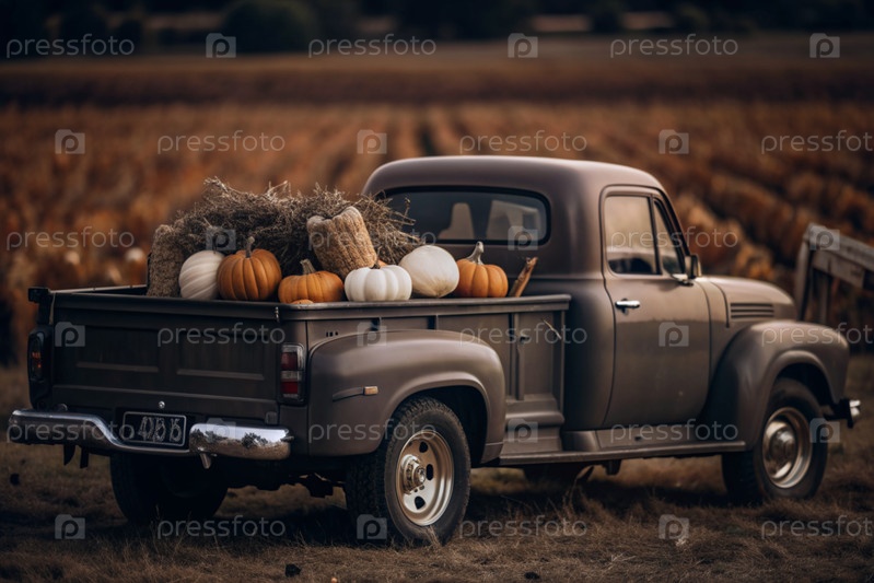 Осень, осенний дизайн.Большой урожай тыквы на заднем сиденье ретро-пикапа, крупный план