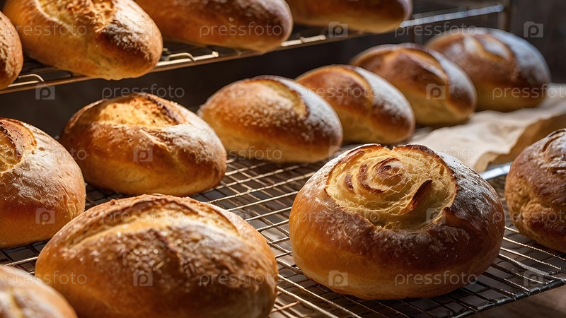 Печьте хлеб на фабрике. Свежий вкусный хлеб в пекарне. Свежевыпеченный кисломолочный хлеб с золотой корой на фабрике. Контекст пекарни со вкусным хлебом