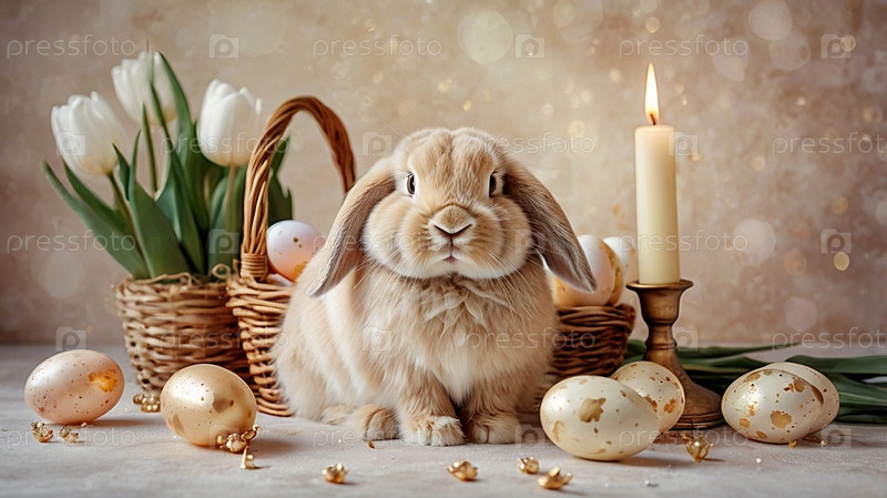Нежные пасхальные жемчужинные яйца в корзине, кролик и нежные цветы на пастельном аквареле
