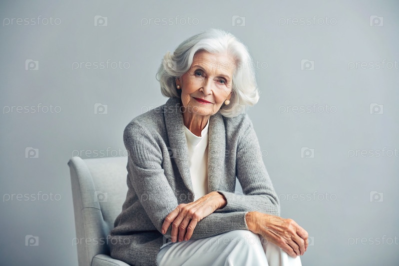 Минимализм.Студийный портрет стильной, элегантной пожилой женщины, 70-летнего пенсионера в интерьере и одежде спокойных тонов.Концепция пожилых людей